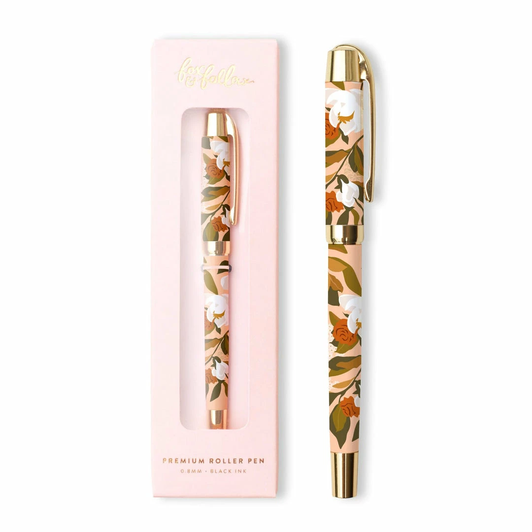 Material: Premium rollerball metal pen with gold foil and gold metal accents, refillable 0.8mm tip, black ink.