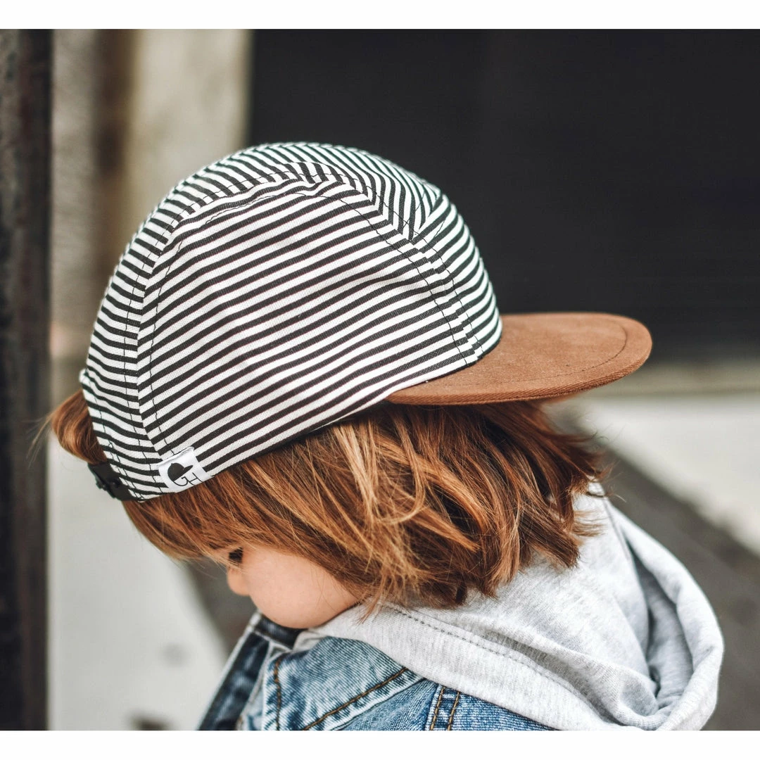 This Stripe 5 Panel Trucker Hat features a soft brushed canvas with black and white stripes with a camel colored brim. This boys’ trucker hat features: