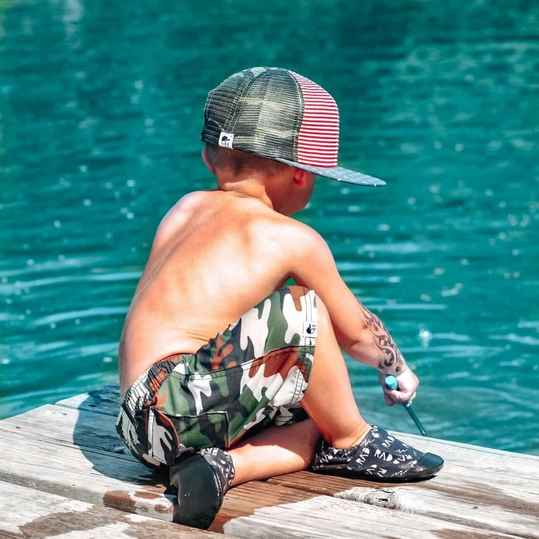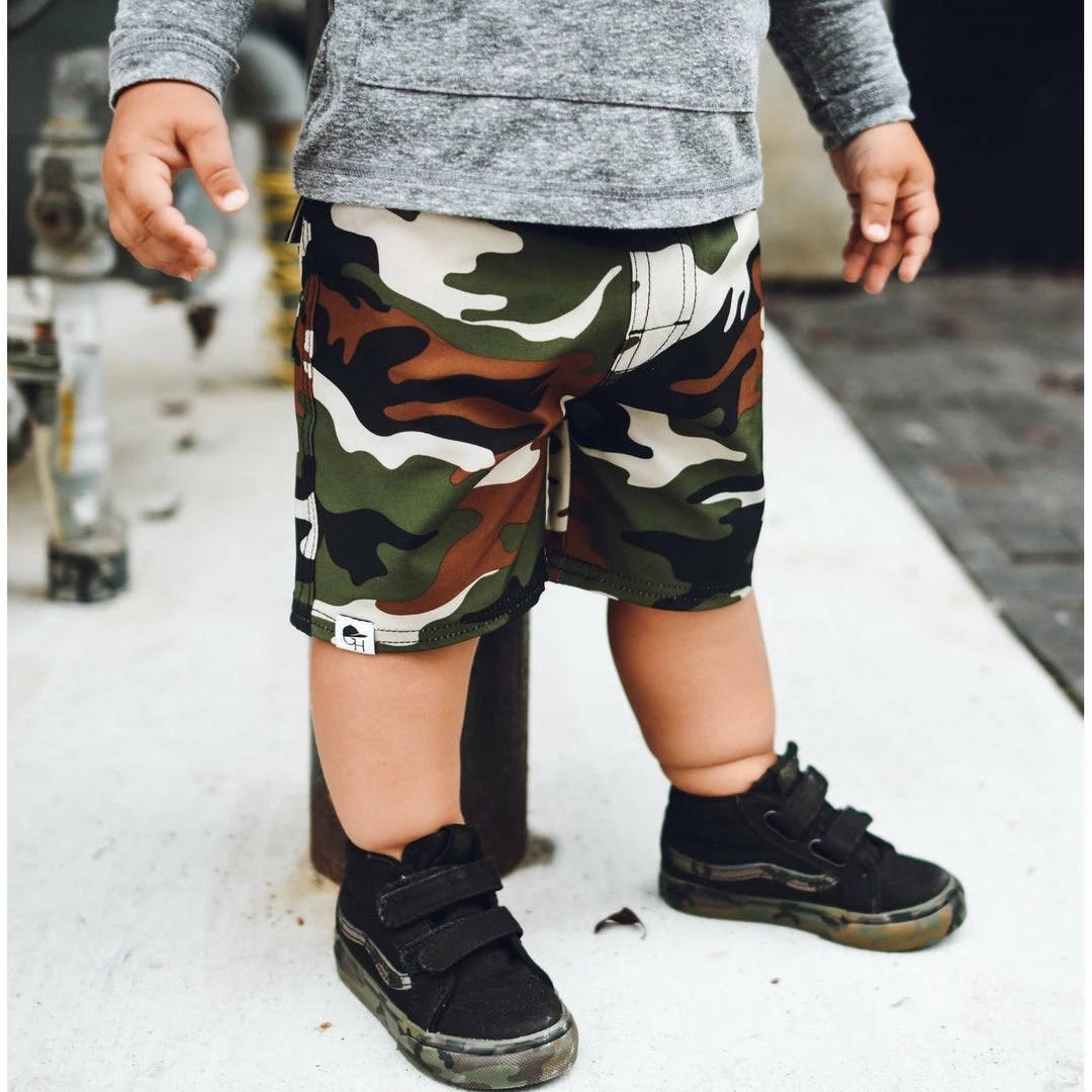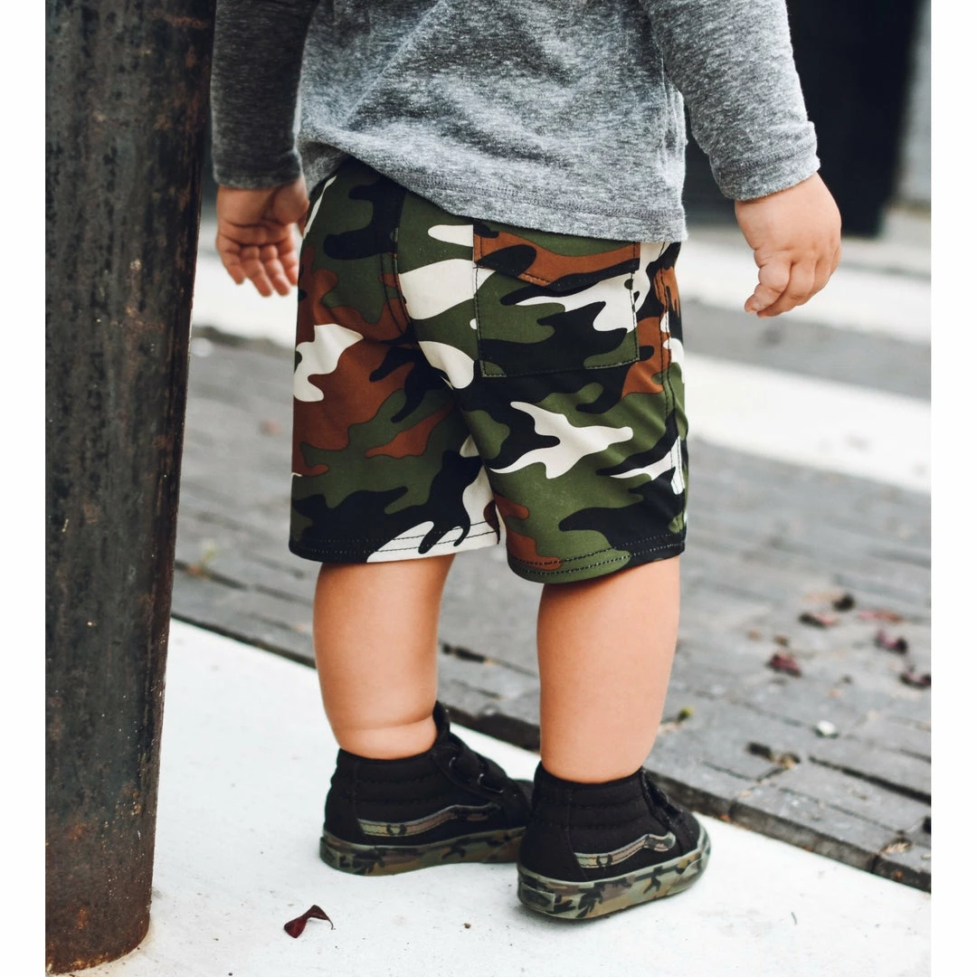 These Camo Walk Shorts are the perfect bottoms for your little one! The shorts are made out of a performance nylon fabric with a two way stretch. These shorts are both functional and stylish with an elastic waistband and velcro back pocket. They’re comfortable, moisture wicking, and made in the USA. Sizing suggestions: