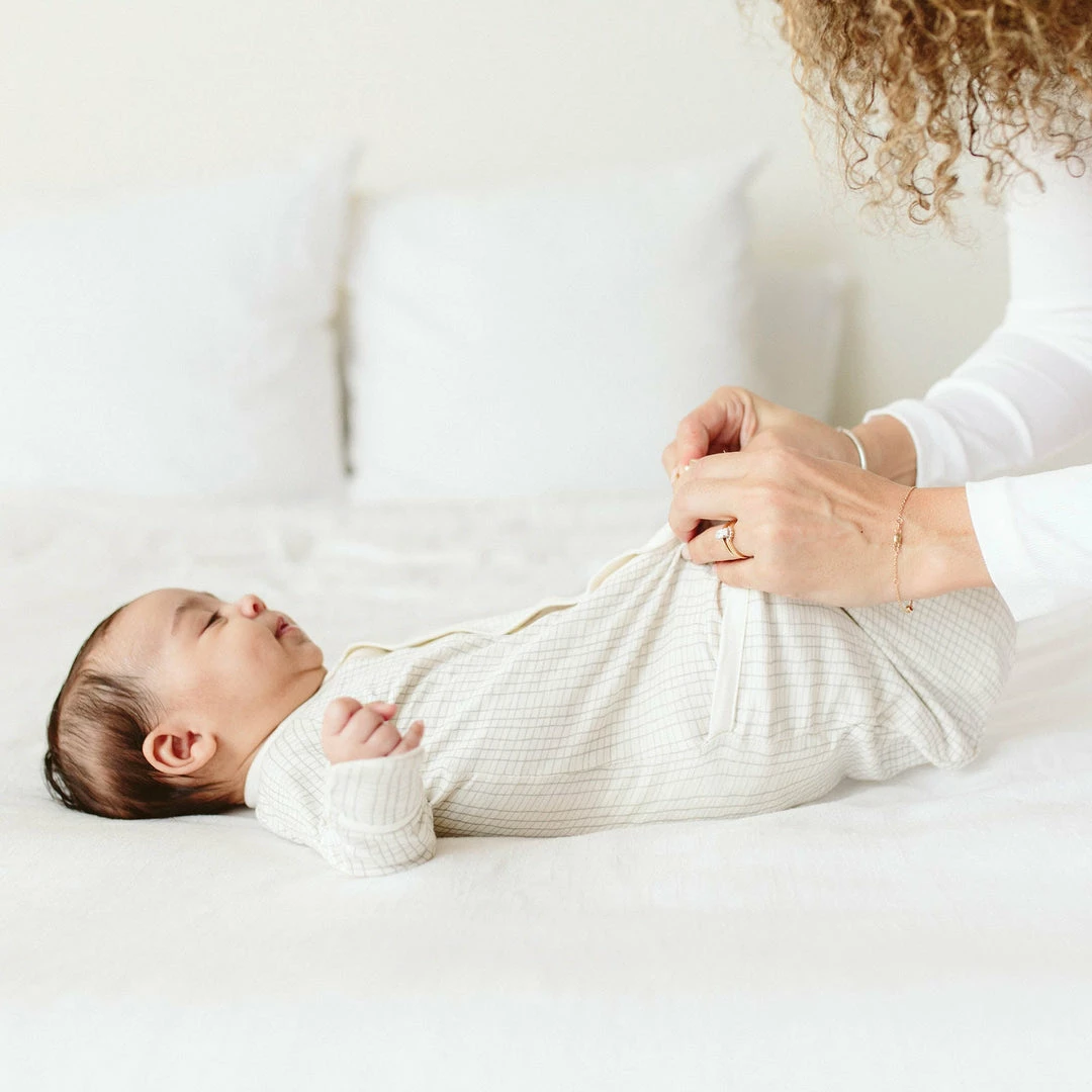 signature integrated mitts with pattern to boost brain development and prevent scratches plus a one-snap foot pocket to quickly change from gown to sleeper (perfect for those 2am diaper changes
