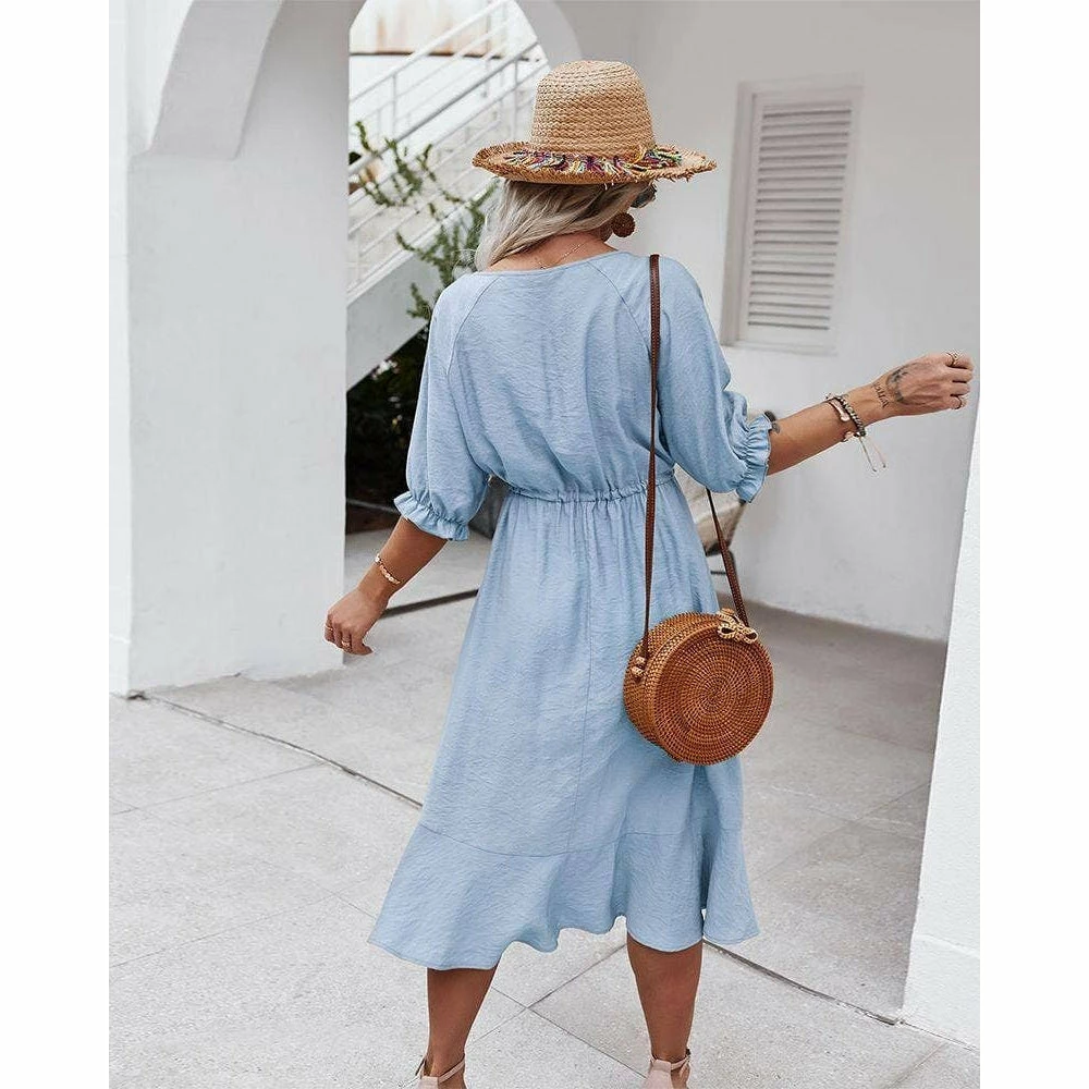 J+j Dresses Light Blue Crochet Detail Puff Sleeve Dress